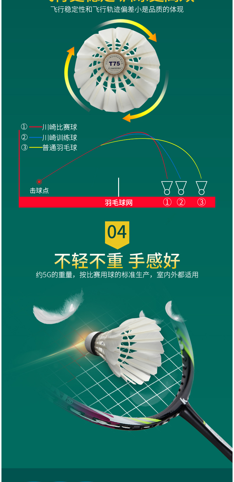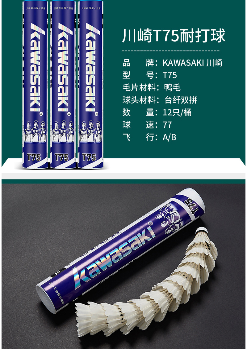 • 商品名称:kawasaki川崎羽毛球12只装耐打王鸭毛鹅毛球打不易烂训练比赛用球(12只装)