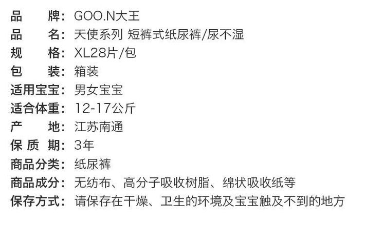 • 商品名称:日本GOO.N大王 婴儿用短裤型纸尿裤天使系列 XL28(箱装)