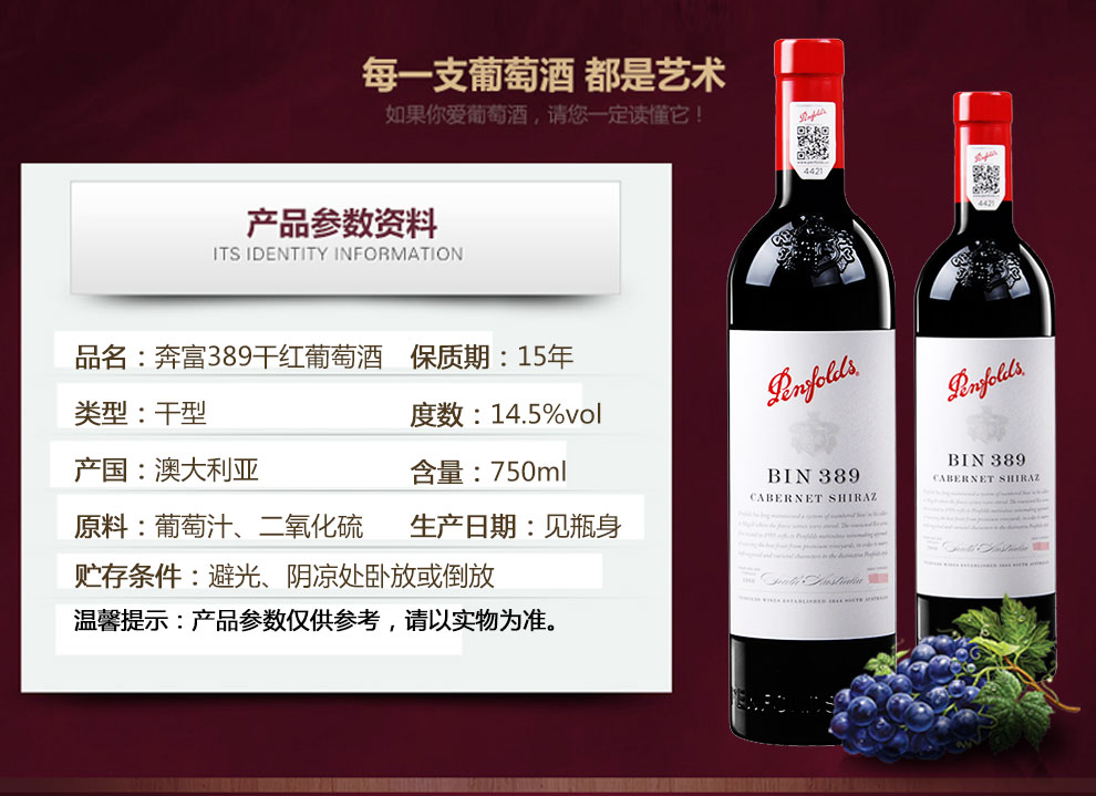 奔富(Penfolds)Bin389设拉子玛塔罗干红葡萄酒进口红酒 750ml*6瓶 整箱装(规格4)(1)